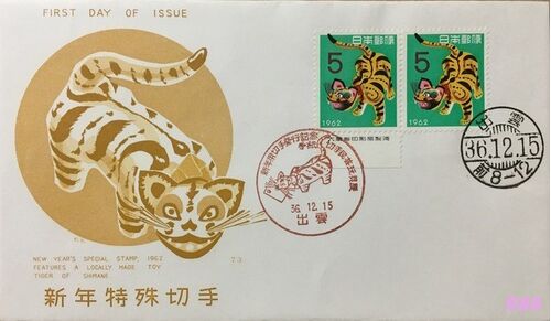 新年特殊切手 虎張子 昭和36年(1961年)12月15日発行 新年用切手発行記念・手紙切手民芸玩具展 出雲小型印 出雲櫛型印 印刷局凸版 また季節が全然違うのですが、年賀切手の初日カバー。 寅年の昭和37年用年賀切手、虎張子です。 印刷局凸版の単色カシェはか…